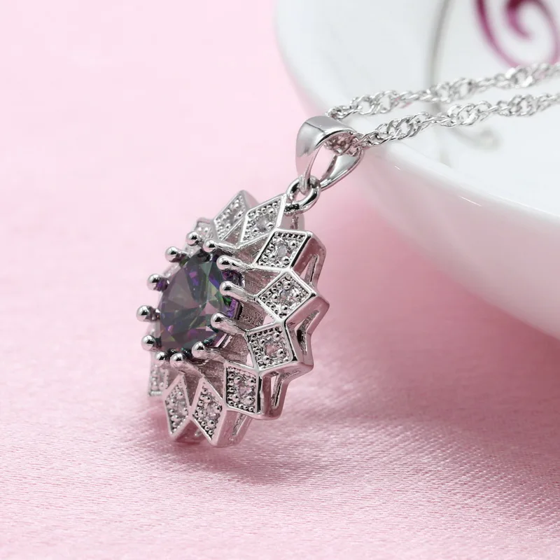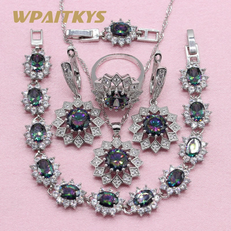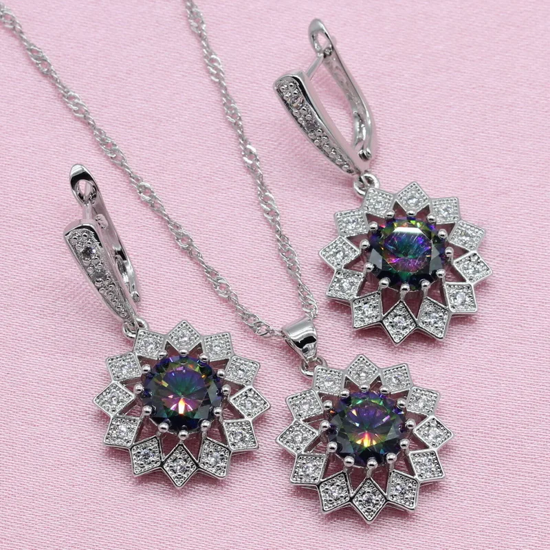 lower price Rainbow Cubic Zirconia 925 Silver Jewelry Sets For Women Wedding Exquisite Flower Shaped Earring Pe