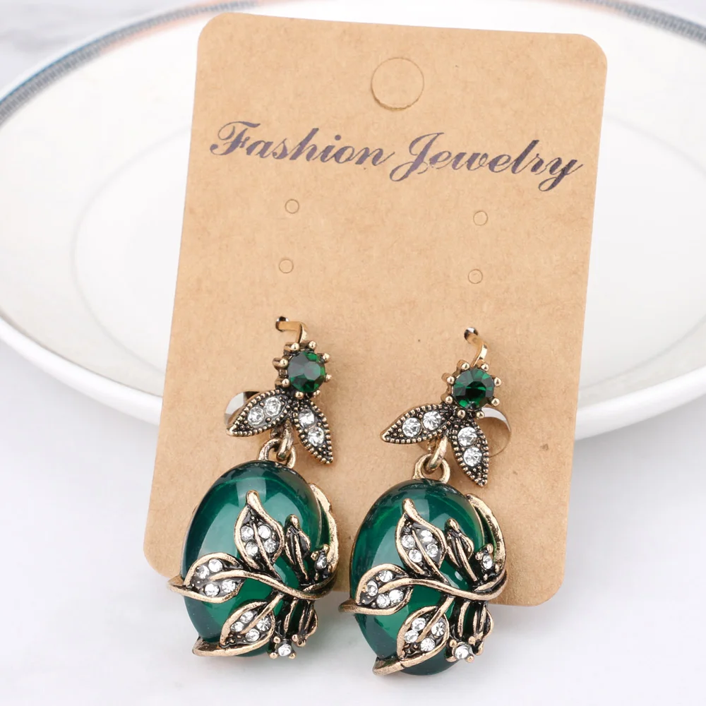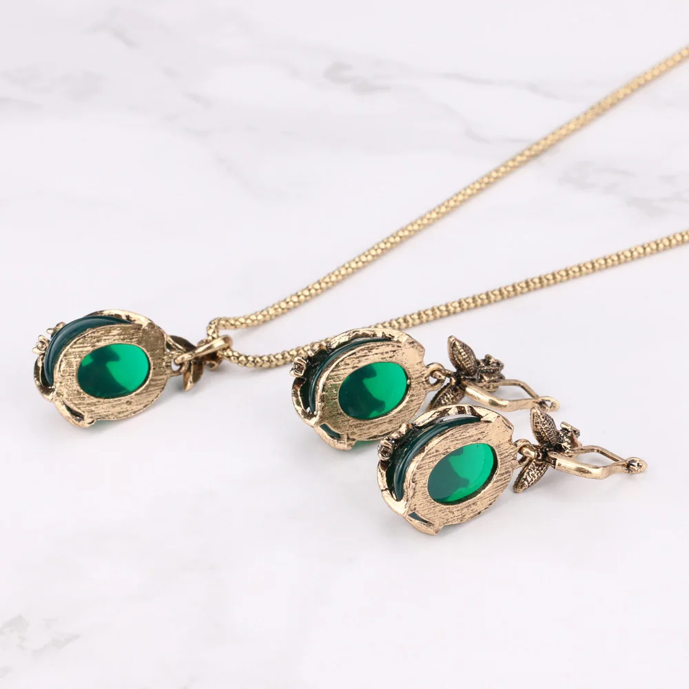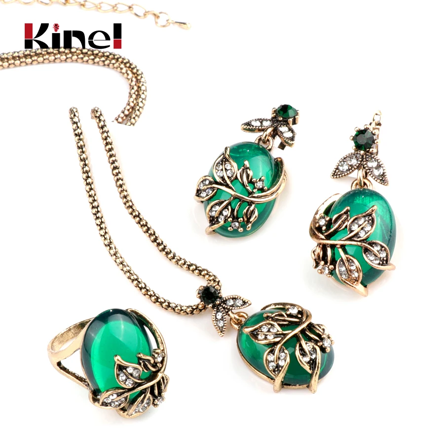 discount Kinel 3Pcs Green Oval Crystal Flower Jewelry Sets Antique Gold Vintage Ring Earring Pendant Necklac