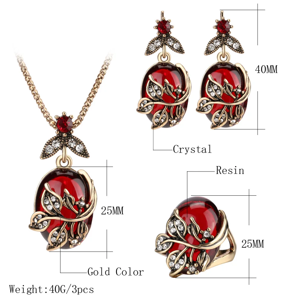 Greatest Kinel 3Pcs Green Oval Crystal Flower Jewelry Sets Antique Gold Vintage Ring Earring Pendant Necklac
