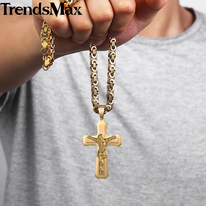 Ideal Jesus Piece Cross Pendant Necklace for Men Gold Silver Stainless Steel Byzantine Necklace 45-90cm M
